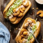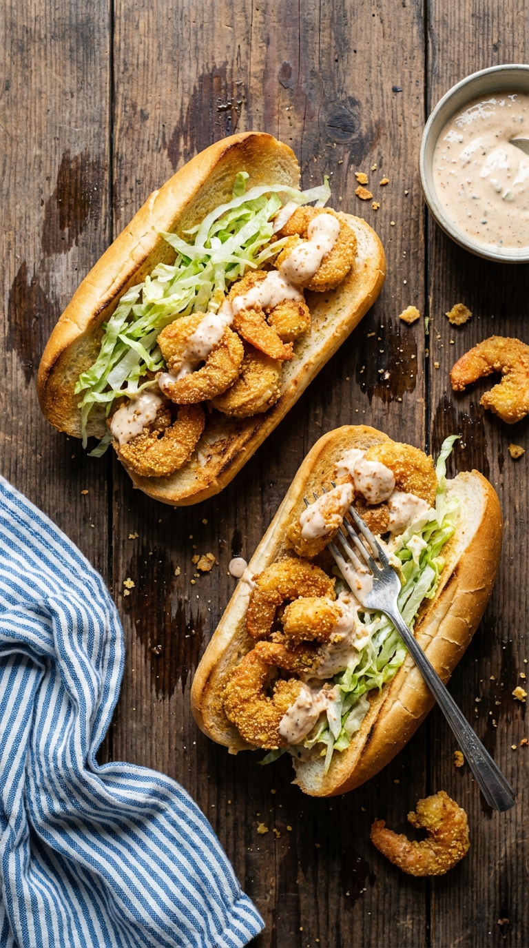 Crispy shrimp, creamy remoulade, and fresh lettuce in toasted hoagies. A simple yet satisfying meal.