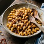 Add the drained pasta to the skillet with the sauce. Toss over medium heat for 1-2 minutes, adding splashes of extra pasta water as needed to create a silky sauce that coats the pasta. The breadcrumbs in the sauce will absorb liquid, so keep adding water until you have a creamy, flowing consistency.