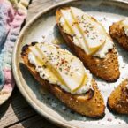 - Just before serving, top toasts with a generous smear of whole milk ricotta, a couple of pear slices, and a drizzle of honey.