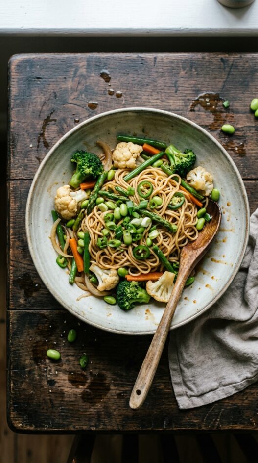 I started making this stir-fry on nights when the fridge was full of vegetables with no clear plan. Quick tip. That’s still when I make it. The sesame oil and Sriracha do most of the work, and the edamame turns a pile of vegetables into something with enough protein to call it dinner. My neighbor once walked in while I had the wok going and stayed for two hours. High heat and a short cooking time are what separate a good stir-fry from a pot of steamed vegetables that happen to be in a pan together.