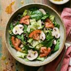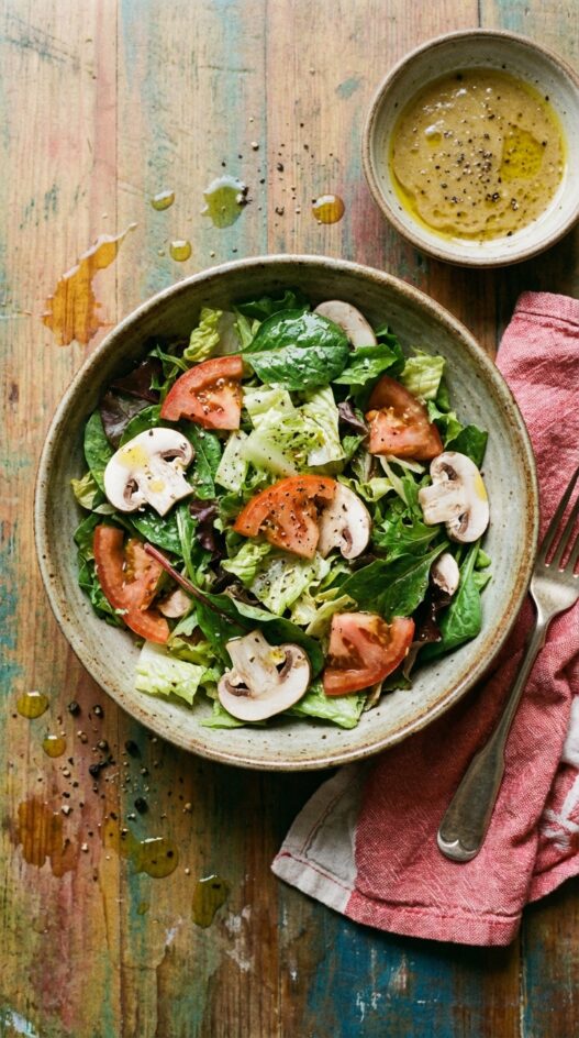 This Dijon vinaigrette is what changed my salad habits for good. I used to reach for bottled dressing without thinking about it, and then one afternoon I made this and realized I’d been doing myself a disservice. Five ingredients, two tablespoons of mustard that does real work as an emulsifier, good olive oil, a sharp white vinegar. The greens can be whatever you have. I love a combination of butter lettuce and something with a little bitterness, like frisée or arugula. Raw mushrooms work in here better than most people expect. They absorb the vinaigrette quietly and add a savory earthiness that makes the whole bowl feel more substantial. Add protein if you want a full meal. Skip it if you don’t. Either way, make the dressing fresh. It takes three minutes and it doesn’t keep very long anyway.