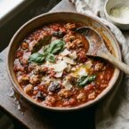 - Serve ladled over cooked pasta with freshly grated parmesan on top.