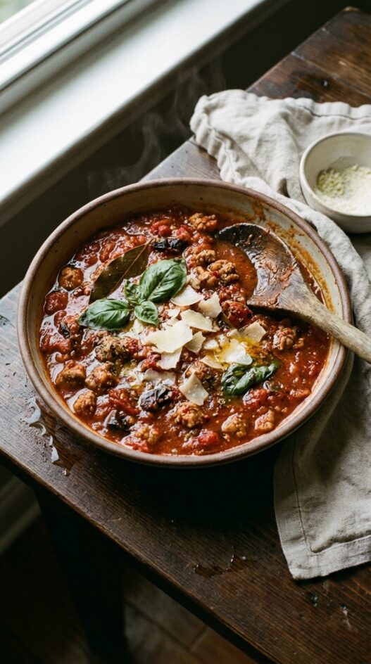 This slow cooker tomato sauce is rich, hearty and comforting. The perfect meal for busy weeknights or Sunday dinner.