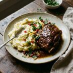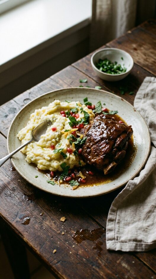 Slow roasted lamb typically needs 3 to 4 hours at a low temperature around 300F to 325F, until the meat is tender enough to pull apart easily. The feta mash can be made while the lamb finishes resting.