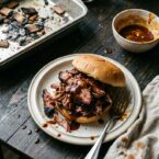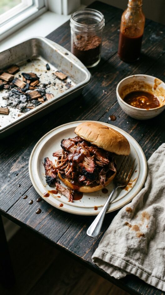 Rest the meat before pulling. Shred it coarsely, toss with the mustard and BBQ sauce mixture, and pile high on the bun. Extra sauce on the side. No napkins will survive this.