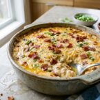 - Sprinkle the top with the cheese and bacon that you had reserved earlier.