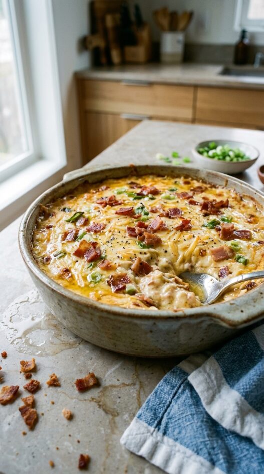 - Introduce the remaining cheese, bacon, scallions, and freshly ground black pepper to the creamy base. Stir well to ensure everything is evenly combined.