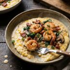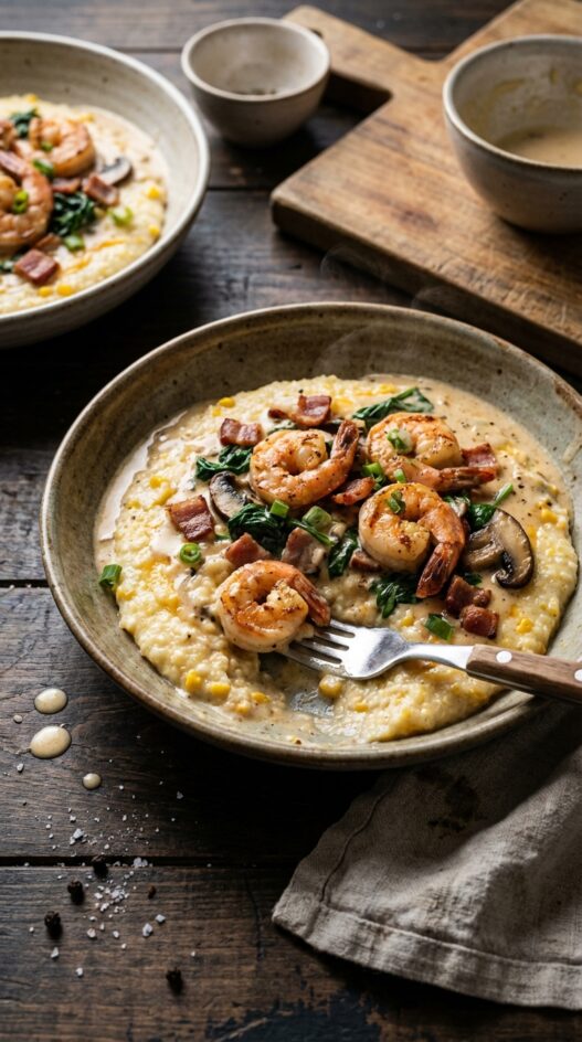 Creamy smoked Gouda grits topped with shrimp cooked in bacon fat, butter, and white wine, then finished with a heavy cream sauce. The grits simmer low and slow with chicken stock, butter, and creamed corn until they’re thick and smooth, then get stirred through with shredded smoked Gouda that melts into every bite. The shrimp cook quickly in rendered bacon fat with garlic, shallots, mushrooms, and spinach before the cream reduces into a sauce that ties everything together.