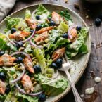 Smoked salmon salad with blueberries and lemon poppy seed dressing is anything but boring. The smoky salmon with the spicy onion and the sweet blueberries make a flavorful combination. Toss in some crunchy pistachios and top it off with a fabulous dressing, and you’re got a delicious and filling meal.