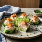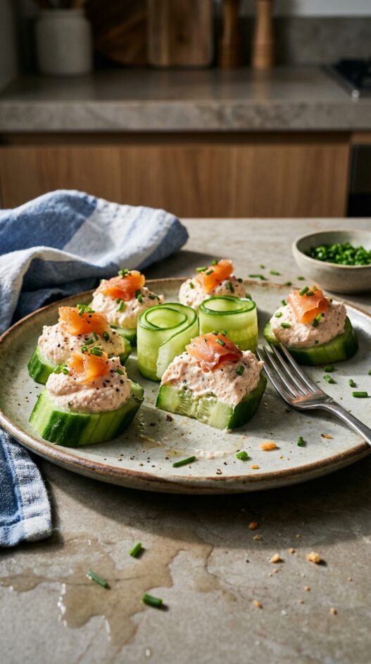 - Whip the whipping cream to soft peaks. Fold into the salmon mixture. Transfer the mixture to a piping bag with a large tip and pipe onto the cucumber slices or into the cucumber rolls.