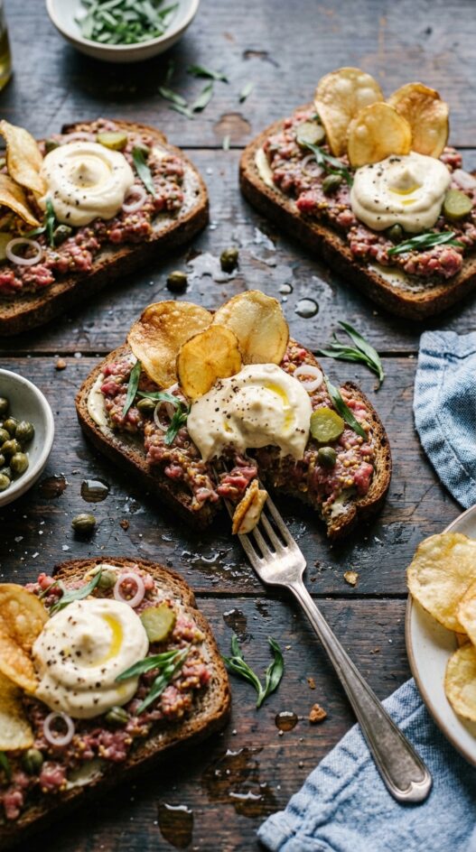 - Final arrangement: Place blended tartare evenly on 4 slices of buttered bread.
