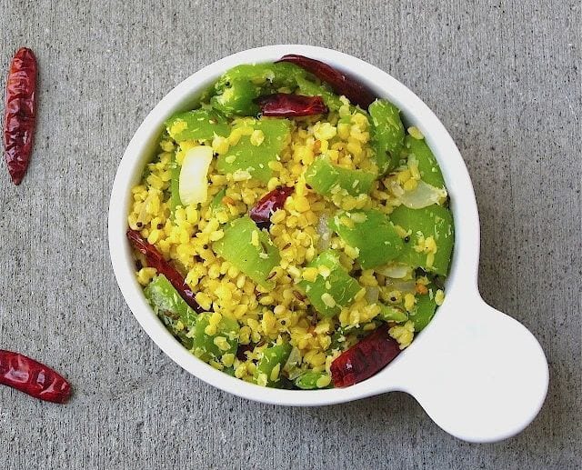 Split yellow moong dal is cooked and stir fried with this thin long vegetable also known as snake gourd or potlakaya. This vegetable offers a good amount of flavor that I love incorporating into my cooking. I usually make this stir fry using to go as an accompaniment to a hot spicy curry to be served with rice. It also goes well with yogurt and rice.