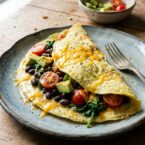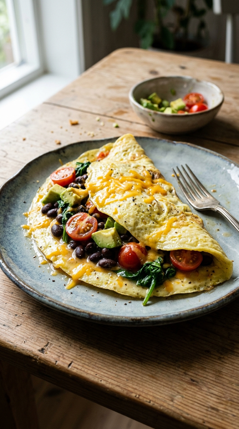 It brightens everything. The filling is avocado, black beans, spinach, and cherry tomatoes, and without the lime juice those flavors sit a little flat together. One tablespoon is enough to cut through the richness of the avocado and the cheddar that goes on top. Toss the filling ingredients together in the bowl first so the lime coats everything evenly before it goes into the omelet.