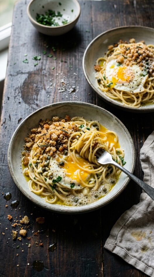 Crispy pangritata breadcrumbs add a delightful crunch to this simple spaghetti dish. Fried eggs and fresh herbs finish it perfectly.