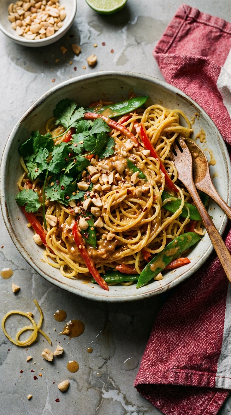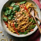 Warm or cold, this vibrant salad is a flavor explosion. Peanut dressing coats spaghetti squash noodles and colorful veggies.