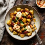 Patatas Bravas is one of the most classic Spanish tapas. Deep fried potatoes, topped with a slightly spicy and smokey tomato sauce and crowned with dollops of garlicky aioli are served at both humble and ambitious restaurants across the nation – usually accompanied by an array of other tapas, and a cold caña (small beer) or copa (glass of wine). It’s rustic, but also elegant in its simplicity, with bold flavors and room for cooks to create their own spin on it.