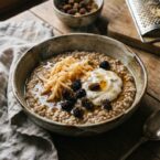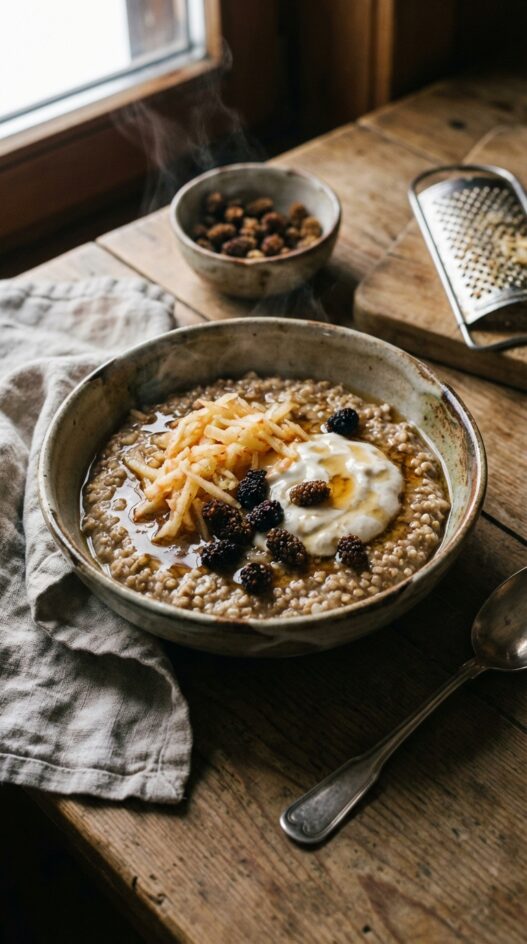 Warm, spiced buckwheat porridge topped with cashew yogurt, mulberries, and a drizzle of maple syrup. A hearty and healthy breakfast bowl.