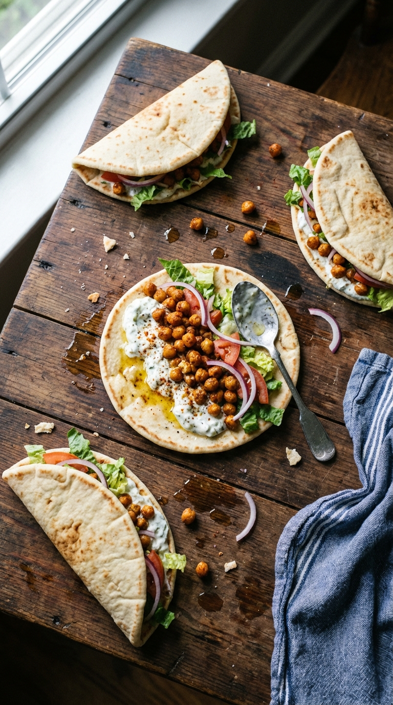 In addition to the spiced chickpeas, you should add lettuce, tomatoes, and red onions to the pita for a fresh and crunchy contrast.
