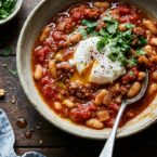 Hearty chorizo and beans simmered with warming spices. A poached egg makes it extra-rich!