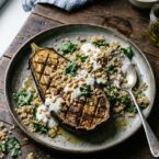 Roasted eggplant gets a flavor boost from warm spices, then its topped with fluffy quinoa and creamy yogurt. A simple, satisfying vegetarian dinner.