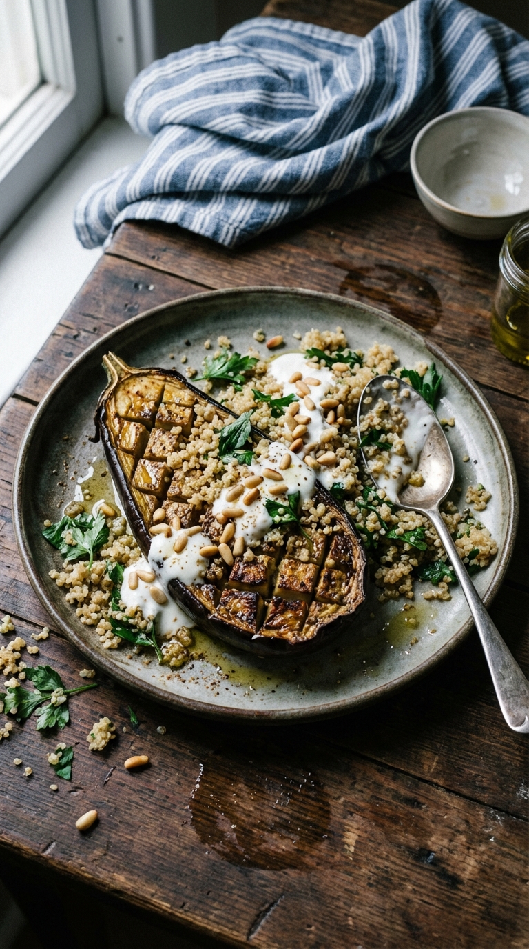 - When the eggplant is cooked, scatter the quinoa and parsley mixture over it. Drizzle with yogurt and top with pine nuts.
