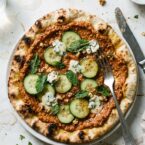 A no-cook flatbread of pita topped with muhammara sauce, fresh cucumber, mint leaves, and crumbled blue cheese. Assembled in two minutes. No oven required.
