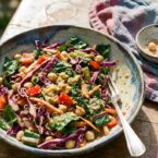 A vibrant Thai-inspired salad with a spicy peanut dressing. Crunchy cabbage and chard tossed with chickpeas and veggies.