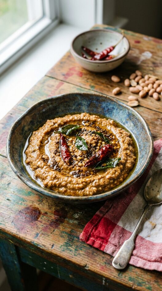 A quick South Indian chutney perfect for breakfast or as a vibrant condiment. The spicy peanut flavor is addictive!