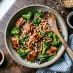 This cozy recipe is made with brown rice ramen noodles (Yay, gluten free!) and it’s dairy free, which is not uncommon for Asian recipes. What I really liked about this one, especially this time of year, is that it’s super easy and pretty fast too. The spicy tahini stir-fry sauce is quick to stir together, the noodles are nearly instant, and then the rest is just a short sequence of adding stuff to the pan until it’s all hot and ready to grab your chopsticks and dive in!