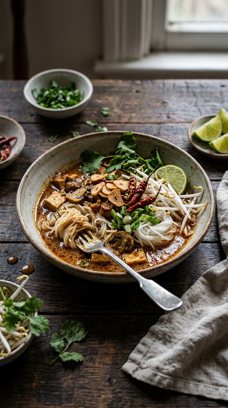 Fragrant Thai curry coats noodles and tofu in a vibrant, spicy sauce. Serve with crispy garlic, chilies, and fresh herbs for extra flavor.