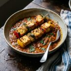 - Heat a grill pan, drizzle with olive oil, and grill the skewers until slightly golden. Set aside.