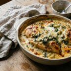 It’s rich. Serve it with something plain, steamed rice, roasted broccoli, or a simple green salad. The spinach-artichoke mixture can be made ahead and kept in the fridge for up to a day.