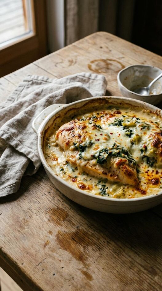 This is chicken breasts baked under a thick layer of spinach-artichoke dip, cream cheese, sour cream, parmesan, garlic, frozen spinach, and canned artichoke hearts. Pound the chicken even, season it, lay it in the baking dish, spread the topping over, and bake at 400°F for about 30 minutes until the chicken is cooked through and the top is bubbly and golden.