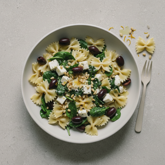 - Add the chopped spinach, sliced kalamata olives, and crumbled feta to the bowl with the pasta. Pour the vinaigrette over everything and toss gently to combine.