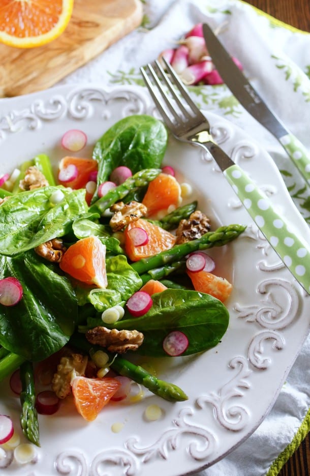 - Add the asparagus spears, orange pieces, scallions, radishes and broken up walnut halves to the salad bowl with the spinach.