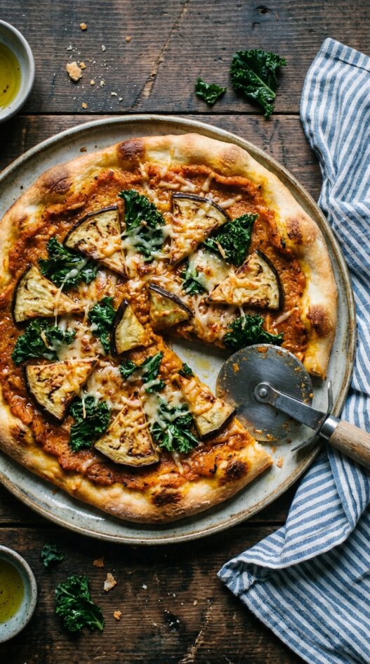 Fall flavors meet pizza night! Roasted butternut squash and broiled eggplant top a crispy crust for a cozy autumn meal.
