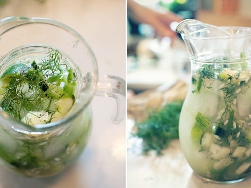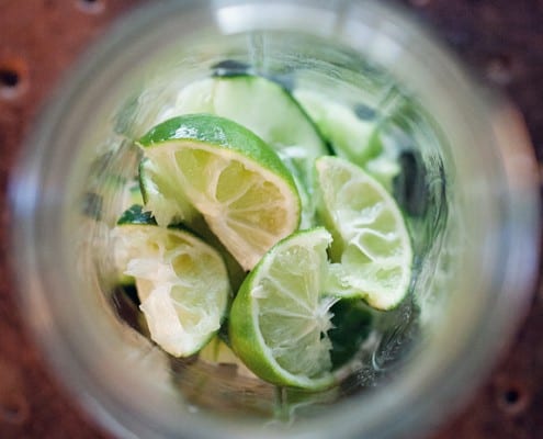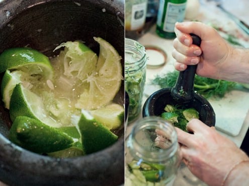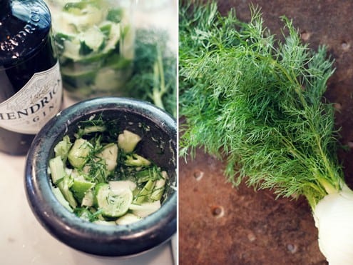 - Put lime, cucumber, and fennel in cocktail shaker and muddle until lime is juiced, and cucumber and fennel are pulpy.