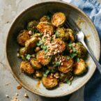 Oil Temperature: Make sure the pan is nice and hot and the oil is almost bubbling before adding any of the brussel sprouts. If they’re sitting over heat too long before crisping up, they’ll get mushy and soft in the middle.