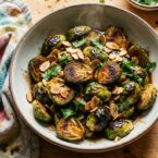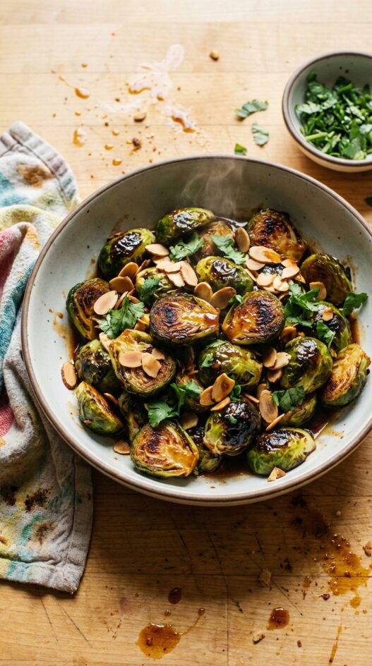Crispy roasted Brussels sprouts tossed in a sweet and spicy glaze. Topped with crunchy almonds and fresh cilantro, this makes a perfect side.