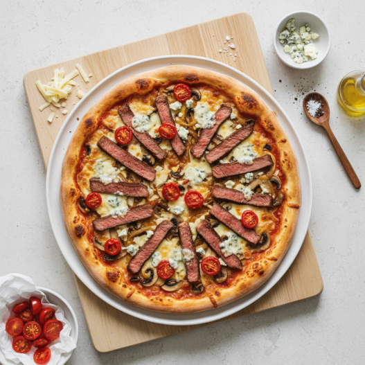 - Once the oven is hot and the pizza crust is parbaked, assemble the pizza: Scatter half the Monterey Jack cheese on the crust. Top with onions and mushrooms. Add the steak, tomatoes, remaining Monterey Jack cheese, and blue cheese; distribute evenly. Return to the oven for 5–10 minutes, until the crust is cooked through and the toppings are brown and melted.