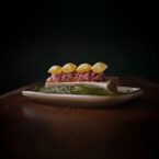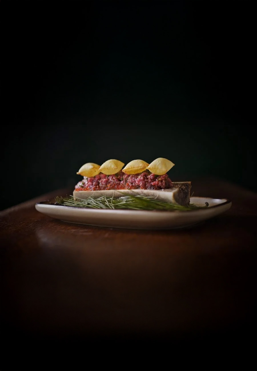 - Place the steak tartare on the marrow.