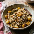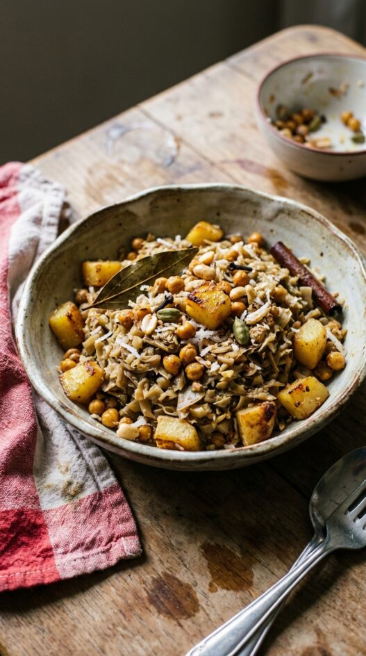 Add the shredded coconut and roasted chickpeas toward the end, just long enough to warm through and pick up a little color. Add them too early and they turn soft and lose the contrast against the softer blossom and potato.