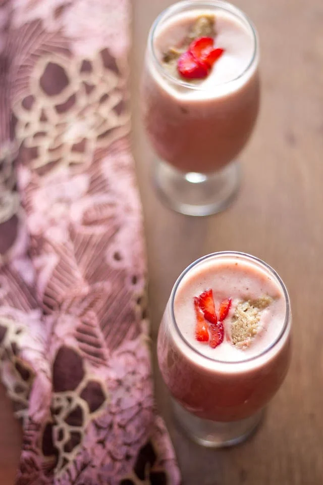 A beautiful and simple recipe for a strawberry almond milkshake.