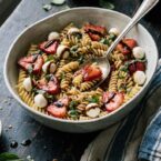 Strawberry Caprese Pasta is loaded with fresh, cool summer flavors and topped with basil and balsamic.