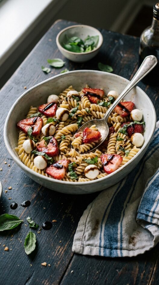Drizzle the balsamic vinegar over the pasta just before serving, allowing it to complement the fresh strawberries and basil.
