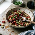 Strawberry salsa is vegan, gluten free and screams of summer! I could eat salsa day and night. I eat it right out of the bowl, with taco chips or on my favorite spoon – displayed here. Ha! We had our last regular season swim meet last night during a lovely thunderstorm and that ended (due to the weather) just before 9 so we missed Taco Tuesday. I make it a point to indulge my girl’s request for tacos each week. I know they will eat everything on their plate and that makes this Italian mama a happy girl.