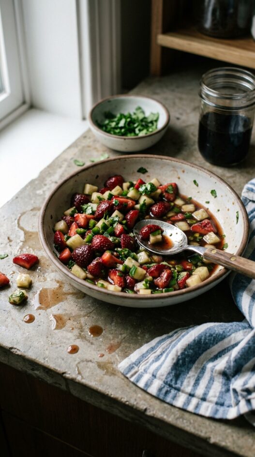 - Combine the strawberries, cucumber, jalapeño, and cilantro in a medium bowl. Add the lime juice and balsamic vinegar. Toss gently to combine without crushing the strawberries.