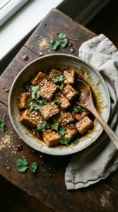 To make the basil balsamic reduction, simmer balsamic vinegar with fresh basil leaves until it reduces by half and thickens slightly, then strain out the basil before drizzling over the crumble.
