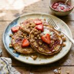 Fluffy pancakes get a fruity, crunchy upgrade with strawberry preserves and granola. A perfect weekend breakfast treat!