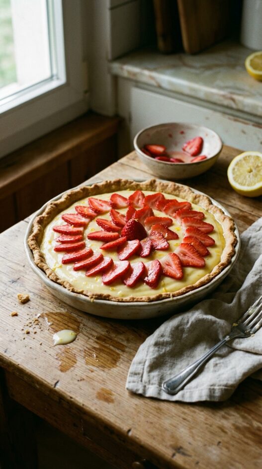 This picture-perfect tart is filled with lemon cream and topped with fresh strawberries in a beautiful rose pattern.